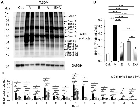 Immunoblotting band images of 4HNE protein adducts and their quantitation data in diabetic ALDH2*2 mutant mice exhibiting HFpEF with vehicle, EMP, Alda-1 and EMP + Alda-1 treatments. Western blot gel images of 4HNE protein adducts and the loading control, GAPDH of cardiac tissue samples from Ctrl, V, E, A and E + A groups (A), their densitometric quantification data (B) and the individual 4HNE protein adduct bands (C) were shown. Data are presented as mean ± standard error of the mean (SEM). n = 4. ** p < 0.01 and *** p < 0.001 refer to the difference between individual groups as shown in (B). * p < 0.05 refer to the difference between individual groups as shown in (C).