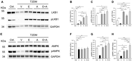 Levels of LKB1, phospho LKB1, phospho LKB1/LKB1, AMPK, phospho AMPK and phospho AMPK/AMPK in diabetic ALDH2*2 mutant mice exhibiting HFpEF with vehicle, EMP, Alda-1 and EMP + Alda-1 treatments. Representative Western blot images of LKB1, phospho LKB1 (pLKB1 i.e., Ser428) and loading control GAPDH (A) and the respective densitometric quantification data of LKB1 (B), pLKB1 (C), pLKB1/LKB1 (D). Representative Western blot images of AMPK, phospho AMPK (pAMPK i.e., Thr172) and loading control GAPDH (E) and the respective densitometric quantification data of AMPK (F), pAMPK (G) and pAMPK/AMPK (H) were shown. Data are presented as mean ± standard error of the mean (SEM). n = 4. * p < 0.05, ** p < 0.01 and *** p < 0.001 refer to the difference between individual groups as shown in (B–D) to (F–G).