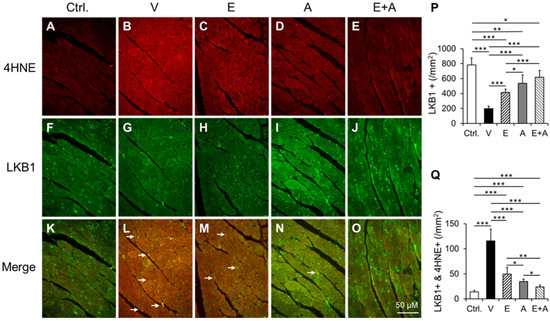 Co-immunostaining of LKB1 and 4HNE protein adducts in the cardiac sections. Representative micrographs of cardiac sections with immunostaining of LKB1 and 4HNE adducts and their merging from non-diabetic ALDH2*2 control mice (Ctrl) (A,F,K), ALDH2*2 diabetic mice exhibiting HFpEF with vehicle (V) (B,G,L), (E) (C,H,M), (A) (D,I,N) and E + A (E,J,O) treatments. The white arrows show co-immunopositivity of LKB1 and 4HNE protein adducts. Quantification data of LKB1+ (P) and co-immunostaining of 4HNE with LKB1 (Q) was shown. Data are presented as mean ± standard error of the mean (SEM). n = 4. * p < 0.05, ** p < 0.01 and *** p < 0.001 refer to the difference between individual groups as shown in (P,Q).