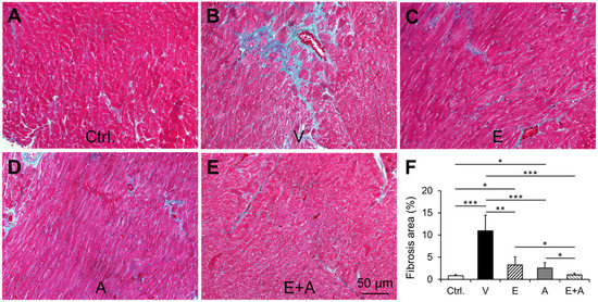 We found a significant increase in myocardial fibrosis in vehicle-treated ALDH2*2 mice with diabetes-associated HFpEF in relation to control (Figure 10A,B,F). EMP or Alda-1 significantly reduces myocardial fibrosis (Figure 10A–D,F). EMP + Alda-1 induced decrease in myocardial fibrosis was significantly higher than EMP or Alda-1 (Figure 10A–E,F).