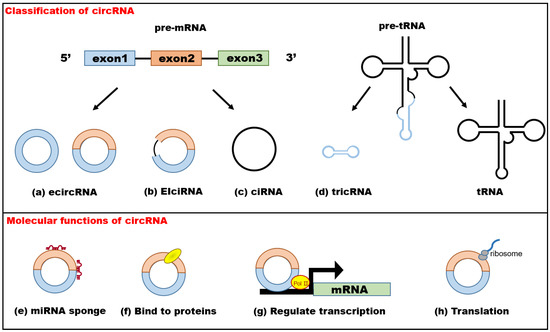 According to the different biogenesis mechanisms, circRNAs can be divided into exonic circRNAs (ecircRNAs), which participate in only exon circularization; intronic circRNAs (ciRNAs), which participate in only intron circularization; exonic–intronic circRNAs (EIciRNAs), which participate in circularization involving exons and introns; and tRNA intronic circRNAs (tricRNAs), which are derived from splicing pre-tRNA introns [17]. There are three main modes of the formation of ecircRNAs and EIciRNAs: exon-skipping or lariat-driven circularization, direct back-splicing or intron-pairing-driven circularization, and RNA-binding-protein-driven circularization [18]. The biosynthesis of ciRNAs was thought to be initiated by the lariat of removed introns during the pre-mRNA splicing process and mainly depended on a 7-nt GU-rich element near the 5′ splice site and an 11-nt C-rich element close to the branch-point site [19]. The formation of tricRNA requires tRNA splicing enzymes to divide pre-tRNA into two parts: tricRNAs are generated by a 3′–5′ phosphodiester bond, and the other part generates tRNAs [20].