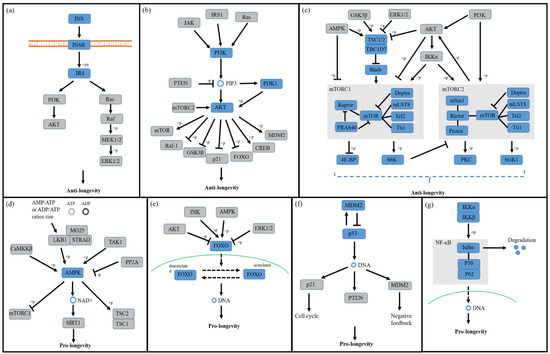 Signal transduction through seven age−related signaling pathways. (a) IIS signaling pathway; (b) PI3K−AKT signaling pathway; (c) mTOR signaling pathway; (d) AMPK signaling pathway; (e) FOXO signaling pathway; (f) p53 signaling pathway; (g) NF−κB signaling pathway. The blue squares indicate the core factors in each pathway, while the gray squares indicate the upstream or downstream targets.
