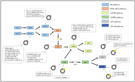mTOR is a central factor in the signal transduction network, and can be activated by AKT but is inhibited by AMPK. We divided the circRNAs involved in the mTOR signaling pathway into three parts, namely, those involved in the AKT-mTOR axis, those involved in the AMPK-mTOR axis, and those that directly target mTOR. Among them, circRNAs mainly function as miRNA sponges.