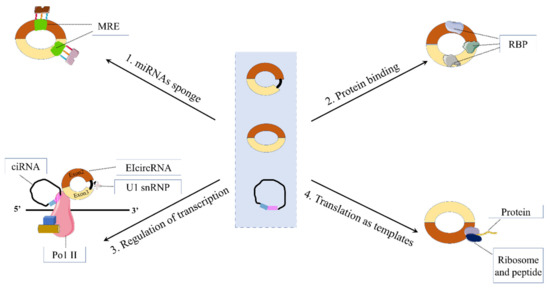 - Li, Z.; Huang, C.; Bao, C.; Chen, L.; Lin, M.; Wang, X.; Zhong, G.; Yu, B.; Hu, W.; Dai, L.; et al. Exon-intron circular RNAs regulate transcription in the nucleus. Nat. Struct. Mol. Biol. 2015, 22, 256–264. [Google Scholar] [CrossRef] [PubMed]
