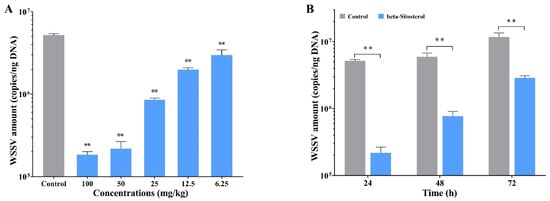Beta-sitosterol inhibited the replication of WSSV in vivo. The experimental workflow is shown in Figure S3. (A) Beta-sitosterol with different concentrations (6.25, 12.5, 25, 50, and 100 mg/kg) had significant inhibitory effects on WSSV replication in crayfish (24 hpi). (B) Effects of beta-sitosterol (50 mg/kg) on WSSV replication at 24, 48, and 72 hpi. The data are shown as mean ± SD (n = 5). Asterisks indicate the significant difference between the experimental and control groups (** p < 0.01).