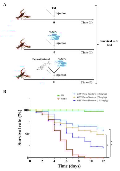 Beta-sitosterol increased the 12 day survival rate. (A) The experimental workflow. (B) The 12 day survivorship curves of crayfish in different groups. Asterisks indicate the significant difference between the experimental and control groups (* p < 0.05, ** p < 0.01).