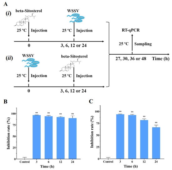 Beta-sitosterol conferred the prophylactic and therapeutic effects against WSSV infection in vivo. (A) (i) and (ii) are the workflows of (B,C), respectively. (B) The inhibition rate of beta-sitosterol (50 mg/kg) injected before WSSV infection at different times (3, 6, 12, and 24 h). (C) The inhibition rate of beta-sitosterol (50 mg/kg) injected after WSSV infection at different times (3, 6, 12, and 24 h). The WSSV-infected group was set as the control group. Data are shown as mean ± SD (n = 5). Asterisks indicate the significant difference between the experimental and control groups (** p < 0.01).