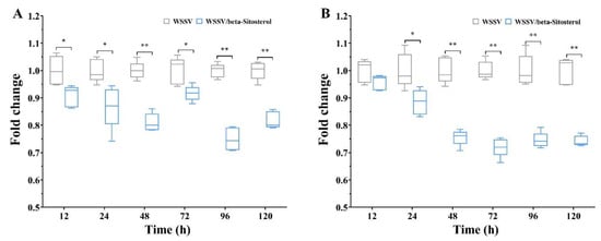 Beta-sitosterol (50 mg/kg) reduced total protein levels in hemolymph and gill tissues of crayfish after WSSV infection at different times (12, 24, 48, 72, 96, and 120 h). (A) Changes in total protein levels in gills under different treatments. (B) Changes in total protein levels in hemolymph under different treatments. The box plots show median value ± standard deviation and the interquartile range of likely variation (n = 5). Asterisks indicate the significant difference between the experimental and control groups (** p < 0.01, * p < 0.05).