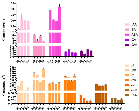Significant differences were observed among the contents of the 12 endogenous hormones (Figure 2). Of all the 12 hormones examined, ABA content was the highest at all four statuses, exhibiting a trend of first decreasing (S0 to S2) and then increasing, with the highest value found at S3. GA1 content illustrated the opposite trend to ABA content, which showed a trend of first increasing (S0 to S1) and then decreasing, with the lowest value found at S3. These results indicated that the reduction in ABA content coupled with the increase in GA1 content from S0 to S1 promoted the axillary bud dormancy breaking, preparing for the following spike initiation.