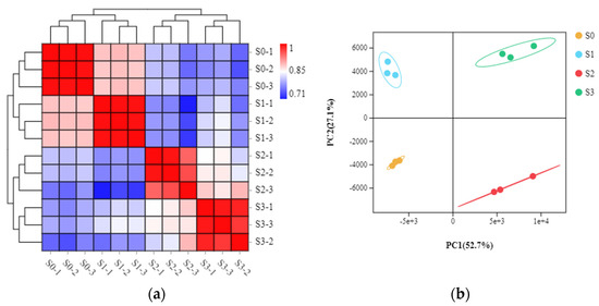 Pairwise Pearson correlation coefficients of the sequencing data from three replicates of each sample collected at the four statuses (a). Principal component analysis (PCA) of transcriptome data of the samples collected at the four statuses (b).