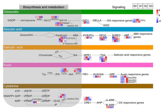Thirty-eight DEGs identified from pairwise comparisons among the four statuses of spike formation were assigned to endogenous-hormone-related biosynthesis, metabolism, and signal transduction pathways (Figure 7; Supplementary Table S6).
