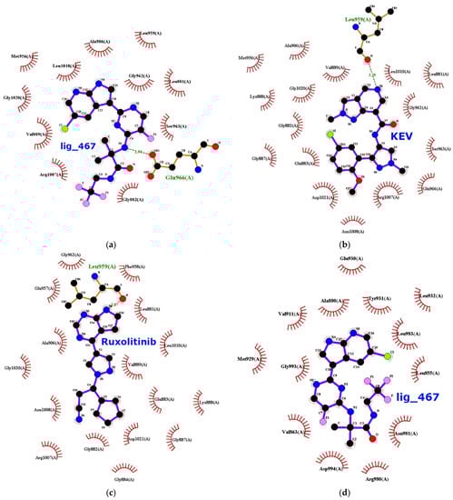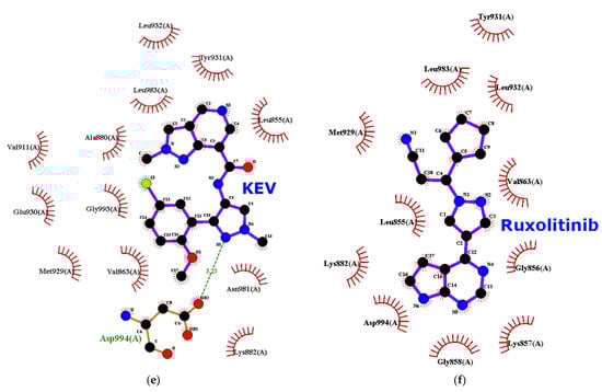 | Ruxolitinib | −8.3 | ARG879, LEU881, GLY884, GLY962 | 0 | 16 | −8.0 | LEU855, GLY858, ARG980, LEU983 | 0 | 11 |