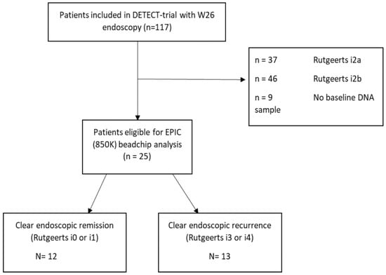 Peripheral blood samples were obtained from established CD patients after undergoing ICR at 17 regional and academic hospitals across the Netherlands and Belgium between February 2014 and June 2017. Patients participated in the DETECT trial []. In short, the goal of this randomized controlled trial was to determine the efficacy of high-dose vitamin D as an anti-inflammatory treatment in patients following primary ileocolonic resection. From a total cohort of 117 patients with a follow-up endoscopy at week 26, twenty-five patients were selected with either clear endoscopic remission (modified Rutgeerts i0 or i1) or severe endoscopic POR (modified Rutgeerts i3 or i4). We purposely removed patients with a modified Rutgeerts score of i2a or i2b due to ongoing debates regarding the classification of these stages as well as high rates of inter-observer variability for this score [,,]. A detailed description of the modified Rutgeerts scoring can be found in Table S1 [].