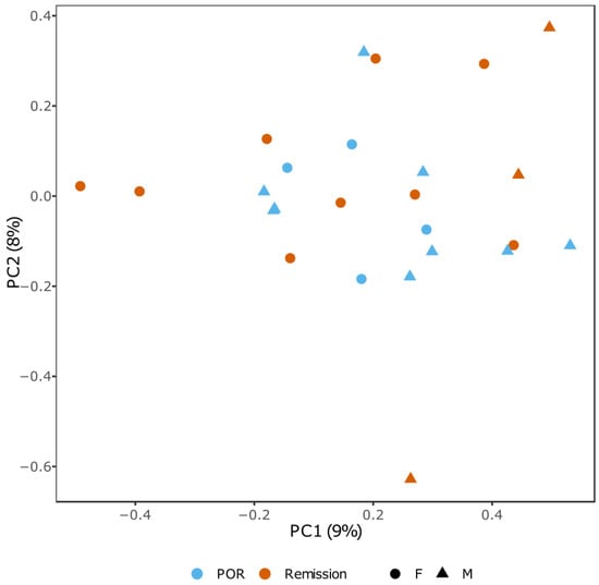 PCA plot of endoscopic remission vs. recurrence. Principal component analysis of genome-wide DNA methylation profiles in patients with endoscopic POR (blue) or remission (orange) at week 26, stratified for gender.