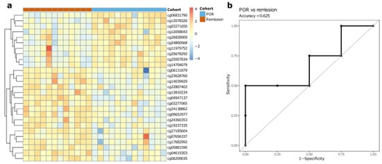 In an effort to properly assess the prognostic capability of the DNA methylome in discriminating endoscopic remission from endoscopic POR, we performed an elastic net binomial classification analysis. Through repeated cross-validation, we identified a set of 27 CpGs as being the most capable of discriminating patients developing endoscopic POR from patients remaining in remission based on the training set. However, testing this model on the withheld test set yielded an accuracy of 0.625 (sensitivity = 0.6; specificity = 0.67; Figure 4). Taken together, we observed that individual loci by themselves offer a limited capability of distinguishing patients that will develop endoscopic POR from patients that will remain in remission.