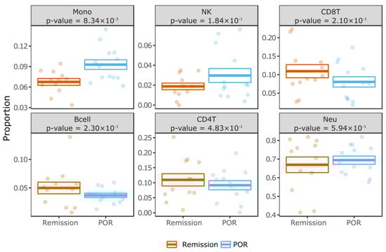 As peripheral blood contains a heterogeneous cell population, we estimated the cellular composition based on DNA methylation data []. Comparing the estimated cellular proportions between patients that went on to develop endoscopic POR with patients that would remain in remission suggested a significant difference in monocyte proportions (p-value = 0.008). Specifically, patients that went on to develop endoscopic POR presented a higher monocyte population compared to patients that remained in remission (Figure 5).