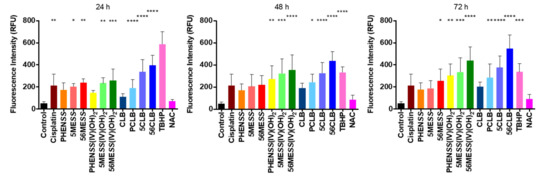 | Compounds | ROS Production in Different Time Intervals (RFU) | ||