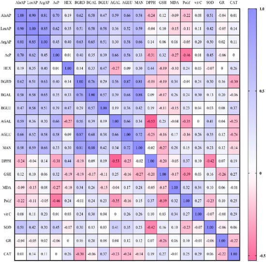The highest correlations were observed between AlaAP and LeuAP (r = 0.897) in the aminopeptidases group and between β-Gal and MAN (r = 0.880) in the glycosidases group (Figure 1.). Furthermore, rumen aminopeptidases were positively correlated with all the investigated glycosidases and superoxide dismutase (SOD) after feeding the cows with dried apple pomace as a feed additive. The most significant correlation were observed for AlaAP and AcP (r = 0.695), LeuAP and MAN (r = 0.588) and ArgAP and β-Gal (r = 0.646). In turn, among glycosidases significant correlations were determined between β-Gal and MDA (r = 0.263), polyphenols (r = 0.237), vitamin C (r = 0.299), and GR (r = 0.200). The most negative dependences were shown between BGRD and DPPH (r = −0.185), GSH (r = −0.185) and catalase (r = −0.298). Significant positive correlations were found between DPPH and HEX (r = 0.439) and polyphenols (r = 0.369), while negative ones for three glycosidases such as α-Gal (r = −0.533), α-Glu (r = −0.246), ACP (r = −0.306), one aminopeptidase such as AlaAP (r = −0.240), and SOD (r = −0.416). The study showed that there are no significant positive correlations between GSH and lysosomal enzymes except between ACP (r = 0.319) and α-Gal (r = 0.254). Positive correlation was also observed with CAT (r = 0.271), while negative between MAN (r = −0.270), polyphenols (r = −0.390), and GR (r = −0.255). Besides, AcP was negatively correlated with MDA (r = −0.274) and polyphenols (r = −0.463). Moreover, the MDA was positively correlated with polyphenols (r = 0.318), vitamin C (r = 0.337), and MAN (r = 0.278). There was also a positive correlation between polyphenols and HEX (r = 0.244), vitamin C (r = 0.274), while negative with α-Gal (r = −0.345), GSH (r = −0.390). Among the enzymatic antioxidants, the most positive correlations were established between catalase and vitamin C (r = 0.288). In contrast, the negative dependence was determined between SOD and polyphenols (r = −0.232) and between CAT and GR (r = −0.224). Vitamin C was also positive correlated with BGRD (r = 0.240), α-Glu (r = 0.259) and MAN (r = 0.258). SOD was significant correlated with ACP (r = 0.450), BGRD (r = 0.300), α-Gal (r = 0.408), and α-Glu (r = 0.351). Significant correlation was also found between CAT and HEX (r = 0.255), and β-Glu (r = 0.368).