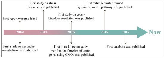Historical process of miRNA research in medicinal plants. GMOs—genetically modified organisms.