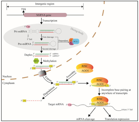 The core promoter region of the miRNA gene has TATA-box and transcription start site (TSS). The TSSs of miRNA genes are mainly located in intergenic regions, introns and reverse complementary sequences of coding sequences [17]. In the nucleus, after transcribed, primary-miRNA (pri-miRNA) having 3′ tail and 5′ cap is formed. One or several internal stem loops are folded from single pri-miRNAs [16]. The length of plant pri-miRNA hairpins is heterogeneous, ranging from approximately hundreds to even thousands of bases [22]. Pri-miRNA hairpins become precursor miRNAs (pre-miRNAs or MIRNAs) when modified by ribonuclease enzyme Dicer-like 1 enzyme (DCL1) [19]. This process is called the first cleavage (Figure 2). The stem-loop of plant MIRNAs has a wider range in length (70 to 350 nts) than that of animal MIRNAs (65 to 70 nts) [24]. In the second cleavage, MIRNA is cleaved into miRNA: miRNA * duplexes (21 to 24 bp) [25]. The two-step cleavage takes place in subnuclear regions called Dicing-bodies [26,27,28].
