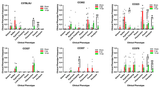 We examined the changes in average phenotype frequencies from 4 to 14 dpi, to determine which clinical symptoms were significantly different for each strain between the early and later acute phases of infection (Figure 1). We found that CC023 mice had a significant difference in frequency of kyphosis observed at the 4 vs. 14 dpi timepoints (p = 0.0179). We found a significant difference in frequency of piloerection between the two timepoints for C57BL/6 (p = 0.0126), and in limb-clasping frequency for CC057 (p = 0.0204). We also observed significant differences between the frequency of paresis for C57BL/6 (p = 0.0044), CC023 (p = 0.0055), and CC078 (p = 0.0213). Finally, we detected a significant difference in phenotype frequency for paralysis for CC002 (p = 0.0046), CC023 (0.0102), and CC078 (0.0087). There were no significant differences in the frequency of seizures or delayed righting reflex between 4 and 14 dpi for any of the strains.