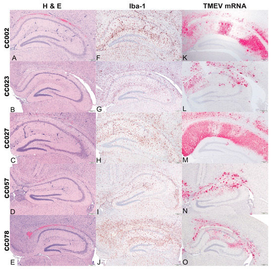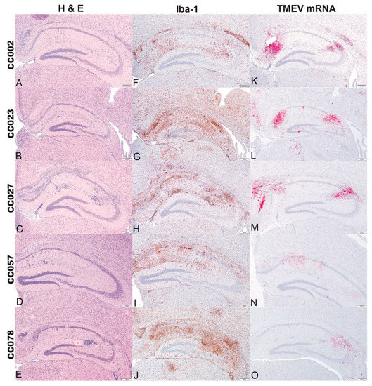 2.4. Histologic Lesions of the Brain, Iba-1 Immunolabeling, and TMEV mRNA Expression in the Hippocampal Formation Demonstrated the Influences of Genetic Background