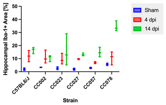 We measured the percentage of Iba-1+ immunopositive areas within the hippocampal formation and found that there were significant differences between sham and infected animals at both 4 dpi (p = 0.0009) and 14 dpi (p = 0.0004) (Figure 4). To further examine the differences between strains and timepoints, we compared the percentage of Iba-1+ area at 4 dpi and 14 dpi for each strain. We did not detect statistically significant differences in Iba-1+ areas between 4 and 14 dpi within strains.