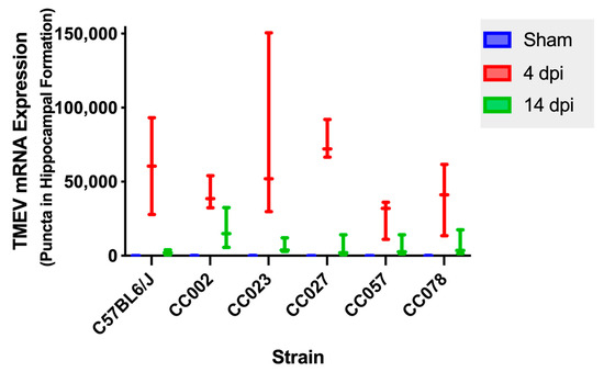 We measured TMEV mRNA expression in the hippocampal formation at 4 dpi and 14 dpi (Figure 5). We compared TMEV mRNA expression between 4 dpi and 14 dpi for each strain and observed a trend towards significance for CC023 (p = 0.0809) and CC027 (p = 0.0809). We did not detect a significant difference between 4 dpi and 14 dpi for the other strains (C57BL6/J, p = 0.1489; CC002, p = 0.1904; CC057, p = 0.1904; CC078, p = 0.1904). However, there was a general trend in decreasing TMEV mRNA expression between 4 dpi and 14 dpi in all strains.