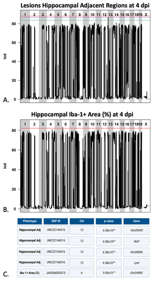 We next performed genetic analyses to identify genetic loci contributing to variation in the TMEV-induced phenotypes we observed. For this, we used gQTL, a web-based software program designed specifically for use with the many diverse genomes represented by CC strains (see Materials and Methods). Quantitative values included numbers of mice with lesions in a given region for each strain, or relative area occupied by Iba1+ microglia for each strain (Iba1+ indicates the presence of activated microglia/macrophages). We identified several genomic regions associated with lesion location and microglial/macrophage reactivity at 4 dpi (Figure 6). We detected statistically significant associations between the frequency of lesions at 4 dpi in the hippocampal adjacent region and a locus on chromosome 13 between base positions 13,472,643–13,654,592 (mouse genome build 38, mm10). This region was also identified in previous investigations of the chronic (90 dpi) phase of infection [16]. Of the four loci located in this region, lysosomal trafficking regulator (Lyst) and nidogen 1 (Nid1) may be candidates for further study due to their known functional relevance [17]. In addition to the associations found for lesion frequency and distribution, we identified an association with Iba-1 immunopositive area of the hippocampal formation at 4 dpi and a locus located on chromosome 6 between base positions 13,096,370–13,143,710 (mouse genome build 38, mm10). Tmem106b is located immediately adjacent to this QTL on chromosome 6, at positions 13,069,759–13,089,269, and may be of particular interest due to its roles in similar conditions such as hypomyelinating leukodystrophy [18,19]. We found no significant QTL associated with viral load at 4 dpi, 14 dpi, or rate of viral clearance.
