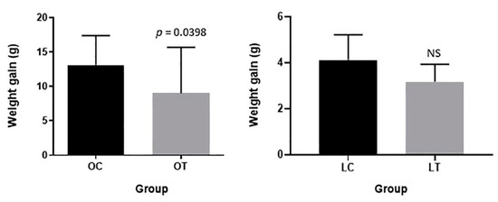 Body weight gain after synbiotic supplementation in obese control (OC), obese treated (OT), lean control (LC) and lean treated (LT) animals. NS: no significance.