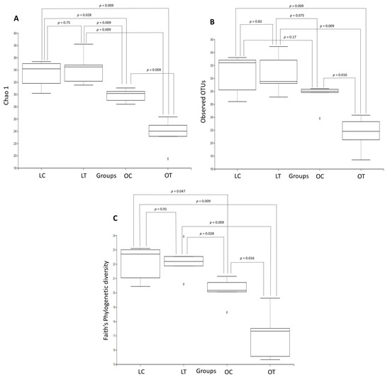 Comparison of the gut microbiota structures in the lean control (LC), lean treated (LT), obese control (OC) and obese treated (OT) groups. Boxplots showing the Chao1 index (A), observed OTUs (B) and Faith’s phylogenetic tree (C) were constructed to evaluate microbiome diversity.