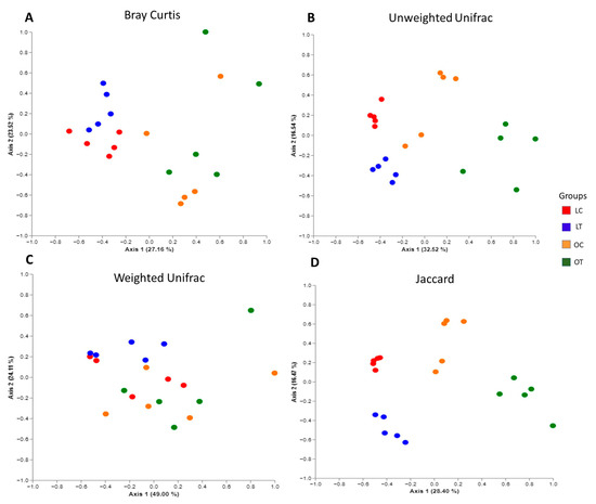 Composition changes in gut microbiota based on PCoA, including Bray Curtis (A), unweighted UniFrac (B), weighted UniFrac (C) and Jaccard (D) analyses of the lean control (LC), lean treated (LT), obese control (OC) and obese treated (OT) groups.