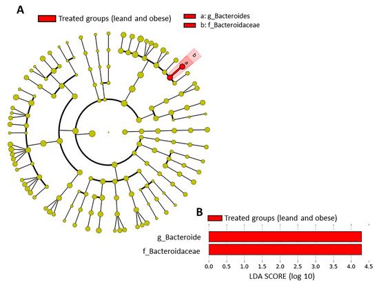 The metagenome analysis LEfSe approach was applied to identify the key phylotypes responsible for the difference between the groups. Bacteroides and Bacteroidaceae, which were more abundant in the treated groups (lean and obese) than in the controls, were the dominant phylotypes that contributed to the difference between the intestinal microbiota in the treated groups (Figure 4A,B).