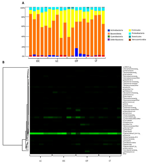 The relative abundance of bacteria under different sample storage conditions is represented by operational taxonomic units (OTUs) according to phyla (A). Heatmap of relative abundance at the genus level (B). Legend: OC, obese control group; LC, lean control group; OT, obese treated group; LT, lean treated group.
