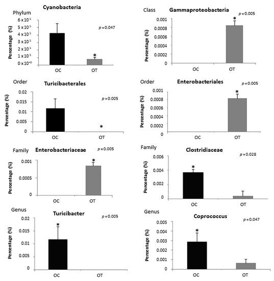 Regarding the phyla, the proportions of Bacteroidetes and Firmicutes observed among samples in the obese treated group compared to the obese control group were 71.02% and 18.19%, respectively (Figure 5A). Figure 5B shows a heatmap representation calculated at the genus level of the classified reads obtained. The Cyanobacteria phylum and the Turicibacterales order were reduced in the obese treated group (p = 0.047, p = 0.005, respectively), and among bacterial classes there was an increase in Gammaproteobacteria (p = 0.005), the bacteria order Enterobacteriales (p = 0.005) and the bacteria family Enterobacteriaceae (p = 0.005). In addition, the Clostridiaceae family (p = 0.026) and the bacterial genera Turicibacter (p = 0.005) and Coprococcus (p = 0.047) were decreased in the OT group (Figure 6).