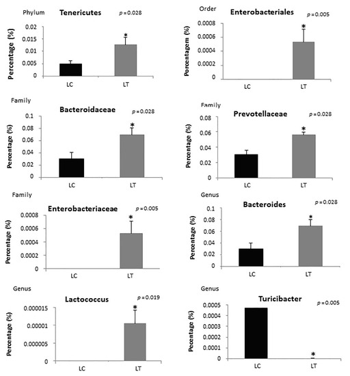 Analysis of the distribution of bacteria in lean control (LC) and lean treated (LT) groups according to phyla, order, family and genus. * Statistical significance.