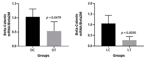 A significant decrease in β-catenin gene expression in the gut tissue was observed in the obese treated group compared to the obese control group (p = 0.0479) and in the lean treated group compared to the lean control group (p = 0.0030) (Figure 8). On the other hand, no significant changes were verified among the groups in the gene expression levels of cadherin (p = 0.4048), occludin (p = 0.2063) or zonulin (ZO-1) (p = 0.171) in the gut tissue (see Appendix A).