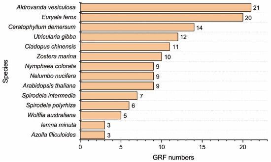 Aquatic plants are one of the important components of aquatic ecosystems, as well as important producers of oxygen and energy in the water, and some of them are hyperaccumulators for the bioaccumulation of heavy metals in aquatic conditions [,,]. Although long-neglected, these plants have valuable scientific research and applied uses, and their unique environmental adaptability provides essential insights for studies on plant adaption []. Recently, a study has shown that GRFs are candidate differentially expressed genes (DEGs) involved in the phenotypic plasticity of the aquatic plant Potamogeton octandru [], indicating the important roles of GRFs in aquatic plants. However, though the characteristics of GRFs have been widely described in terrestrial species, the genome-wide identification and analysis of the GRF families in aquatic plants are still lacking. Due to the important functions of GRFs in plant adaptation, it is urgent to identify GRFs in aquatic species, which may contribute to a better understanding of the molecular mechanisms of adaptation to the submerged environment in aquatic plants.