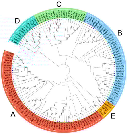 Phylogenetic analysis of the GRFs in A. thaliana and 13 aquatic plants. The neighbor-joining (NJ) phylogenetic tree was generated by MEGA 7.0 with 1000 bootstrap replications on the JTT model. The 139 GRFs were divided into five groups (A–E named by numbers of genes and indicated by five different colors), and the GRFs from different species were labeled with different colored symbols. Tomato circles indicate genes from A. thaliana; Dark orange circles indicate genes from A. filiculoides; Maroon circles indicate genes from A. vesiculosa; Gold circles indicate genes from C. chinensis; Yellow circles indicate genes from C. demersum; Dark gold circles indicate genes from E. ferox; Blue circles indicate genes from U. gibba; Dodger blue circles indicate genes from N. colorata; Medium orchid circles indicate genes from N. nucifera; Cyan circles indicate genes from Z. marina; Deep sky blue triangles indicate genes from L. minuta; Purple triangles indicate genes from S. intermedia; Black triangles indicate genes from S. polyrhiza; Yellow triangles indicate genes from W. australiana.