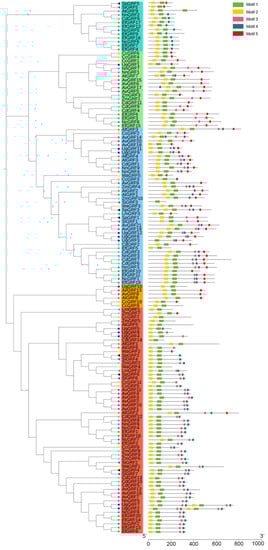 The GSDS online server was used to perform the gene structures of all 139 GRFs. We found that most genes in the same group of the phylogenetic tree had similar gene structures (Figure 3). Among those, EfGRF9 and CdGRF7 had the largest intron length (approximately 12 kb), with seven or five exons, respectively. We also analyzed the conservative structure of these GRFs. Five representative motifs were analyzed through the MEME program, and their positions were illustrated on each gene (Figure 4). We found that all GRFs contain motifs 1 and 2. Group A contains motifs 1, 2, 3, and 4 in most members; group B contains all five motifs in most members; group C contains motifs 1, 2, 3, and 5 in most members; group D contains motifs 1, 2, and 4 in most members; group E contains motifs 1, 2, and 5 in most members. The characteristics of these motifs are listed in Figure S1.