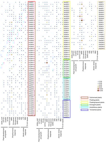 Unlike most animals that can escape from stressful conditions, plants are sessile organisms that must undergo many environmental stresses directly at the place where they germinated. Therefore, plants have evolved many strategies for their adaptation, and cis-acting elements in the gene promoters were verified to be quite efficient to regulate their response to environmental changes []. The relative homogeneity of the water environment, the cloning propagation of aquatic plants, the diverse and efficient transmission modes, and the strong phenotypic plasticity are important factors for the wide distribution of aquatic plants []. However, no comprehensive analysis of the cis-acting elements has been performed on many aquatic species. Therefore, we analyzed 1.5 kb upstream regions of the GRF genes in 13 aquatic plants and identified elements related to plant development (GCN4_motif, CAT-box, circadian, and O2-site) and phytohormone response (MeJA/ABA/salicylic acid/auxin/GA/ethylene-responsive), and identified elements related to abiotic stress responses, such as ARE, LTR, MBS, and TC-rich repeats. Among those, we found that the ABRE cis-elements were highly enriched in the promoter region of the GRFs in floating plants (Figure 4), suggesting the possible function of the ABA in the regulation of GRFs in floating plants.