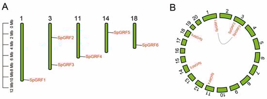 Chromosomal localization, gene collinearity, and synteny analysis of the SpGRFs. (A) Distribution of the SpGRF genes on the chromosomes of S. polyrhiza. The scale bar indicates chromosome length (Mb). (B) Gene collinearity of the SpGRF genes on the chromosomes of S. polyrhiza.