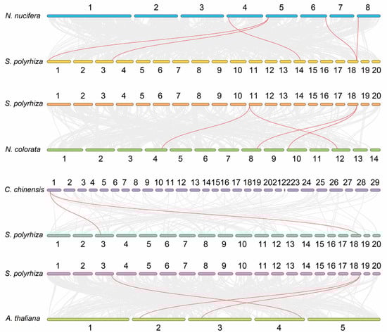 Synteny relationship of the GRF gene pairs between S. polyrhiza and four other plants. The red colour represents syntenic GRFs, and the gray lines show the collinear blocks of the plant genome. The chromosome number was labeled near each chromosome.