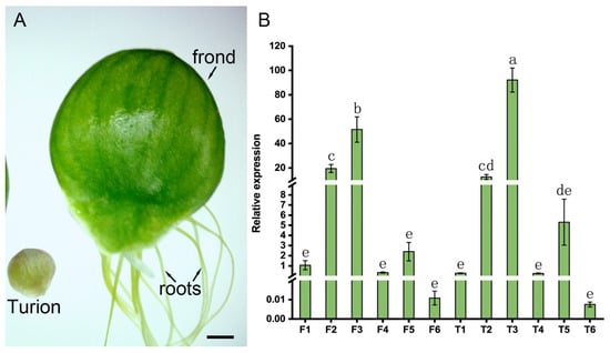 Phenotypes and expression of the SpGRFs in the frond and turion of S. polyrhiza. (A) Phenotypes of turion (left) and whole plant (right) of S. polyrhiza. Bar = 1 mm. Arrows indicate frond or roots of S. polyrhiza, separately. (B) Expression of the SpGRFs in the frond and turion. F1: SpGRF1 in the frond; F2: SpGRF2 in the frond; F3: SpGRF3 in the frond; F4: SpGRF4 in the frond; F5: SpGRF5 in the frond; F6: SpGRF6 in the frond; T1: SpGRF1 in the turion; T2: SpGRF2 in the turion; T3: SpGRF3 in the turion; T4: SpGRF4 in the turion; T5: SpGRF5 in the turion; T6: SpGRF6 in the turion. The different letters indicate statistically significant differences relative to F1, as determined by the Duncan test (p < 0.05).