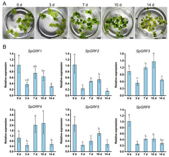 Ten fronds of S. polyrhiza 7498 were aseptically transplanted into a half-strength Schenk and Hildebrandt basal salt mixture (Sigma, S6765) with a 1% sucrose liquid medium at pH 5.8. The cultures were kept in a growth chamber maintained at 60 μmol m−2 s−1 and 25 °C through a 16-h light and 8-h dark photoperiod. A total of 1 μM of ABA (Sigma) was added to each group, as previously reported []. One gram of fresh fronds was taken from a time course of 0 (no ABA), 3, 7, 10, and 14 days of the ABA treatment and frozen in liquid nitrogen. For each time point, we used three biological replicates. The high-quality total RNA was then extracted using a commercial RNA extraction kit (CWBIO), and cDNA was synthesized from 1 μg of the total RNA using a RT reagent Kit (Takara). The TB Green® Premix Ex Taq™ Kit (TaKaRa, Dalian, China) and the Bio-Rad CFX96 touch real-time PCR system (Bio-Rad, Hercules, CA, USA) were used to perform a qRT-PCR. The qRT-PCR program was run under the following conditions: 10 min at 95 °C, 40 cycles of 95 °C for 15 s, 57 °C for 30 s, and 72 °C for 30 s. The Actin gene was used as an internal control []. The 2−ΔΔCt method was employed to calculate the relative expression of the SpGRF genes. The data were presented as means ± standard deviations. A one-way analysis of variance (ANOVA) and the Duncan test were applied to determine the significant differences at the p < 0.05 level. All primers used for the qRT-PCR are listed in Table S2.