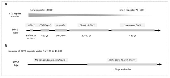 (A). Clinical forms of DM1 are shown. The longest CTG expansions are in CDM1 patients. Patients with short CTG repeats are affected later in life with mild symptoms. (B). DM2 is an adult disease with vary variable length of CCTG expansions.