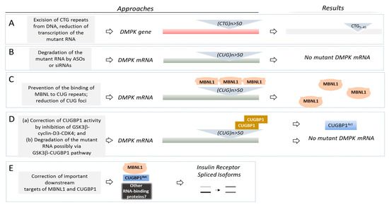 Based on the molecular mechanisms of DM1, multiple approaches were proposed to test DM1 therapeutics in preclinical studies, reviewed in detail in several comprehensive papers [28,38,39]. One of the main approaches is the deletion of CTG expansion from the genomic DNA (Figure 2A). Although this approach is still far from the clinical studies, it is very important because it might remove the DM1 mutation at the level of genomic DNA. The approaches focused on the removal of mutant DMPK mRNA and correction of two major RNA-binding proteins, CUGBP1 and MBNL1, involved in DM1, or their critical downstream targets are tested in the clinical studies; therefore, they might be closer to the transition to clinic (Figure 2B–E).