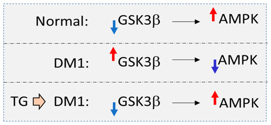 Possible involvement of GSK3β kinase in the regulation of AMPK in DM1. In normal cells, high levels of active AMPK are maintained by the low levels of GSK3β activity. However, in DM1 cells, GSK3β is elevated. Since AMPK is a substrate of GSK3β, the increase in GSK3β may lead to a reduction in AMPK in DM1 cells. It is expected that the correction of GSK3β activity with tideglusib (TG) in DM1 cells might normalize levels of AMPK.