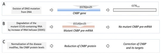 (A–C): The models of the proposed therapeutic approaches for DM2 (see text). Mutant CNBP gene and CNBP mRNA are shown as blue and brown boxes.