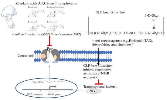 A major form of MDR is the overexpression of ATP-binding cassette (ABC) transporters and P-glycoprotein (Pgp), a 170 KDa transmembrane glycoprotein product encoded by the MDR1 gene. The mechanism of drug resistance in Pgp-expressing tumor cells involves an increase in the extracellular transport of various chemotherapeutic agents, which diminishes cellular accumulation, and thus, decreases drug efficacy [,,]. Anticancer agents with Pgp-mediated MDR include paclitaxel (TAX), doxorubicin (DOX), actinomycin D, vinblastine, and etoposide, whereas Pgp does not affect the cytotoxicity of certain other anticancer drugs, such as 5-fluorouracil, cisplatin, and carboplatin []. To confirm the drug resistance reversal activity of Basidiomycete mushroom extracts collected in Korea, the cytotoxic activity of paclitaxel (TAX), a well-known Pgp-related anticancer drug, on Pgp-positive and -negative human cancer cells in the presence or absence of the tested mushroom extract was compared to that in the presence of verapamil (VER), a well-known MDR reversal agent. Cantharellus cibarius (M02) and Russula emetica (M12) increased the cytotoxic activity of TAX by blocking Pgp-mediated drug efflux in Pgp-positive HCT15 and MES-SA/dX5 cancer cells, but not in Pgp-negative A549 and MES-SA cancer cells. Cantharellus cibarius and Russula emetica also increased the cytotoxicity of doxorubicin, another Pgp-associated anticancer drug, against MES-SA/DX5 cells []. Ganoderma species induced apoptosis in drug-sensitive (H69) and multidrug-resistant (VPA) human small-cell lung cancer (SCLC) cells that were resistant to etoposide and doxorubicin []. Ganoderma lucidum polysaccharide (PLP) inhibits the constitutive activation of NF-κB, decreasing the expression of PGP in cancer cells []. Zhankuic acids A–C isolated from Taiwanofungus camphoratus were found to exert inhibitory effects against Pgp, which reversed drug resistance against doxorubicin, vincritine, and paclitaxel in human cancer cells [] (Figure 1).